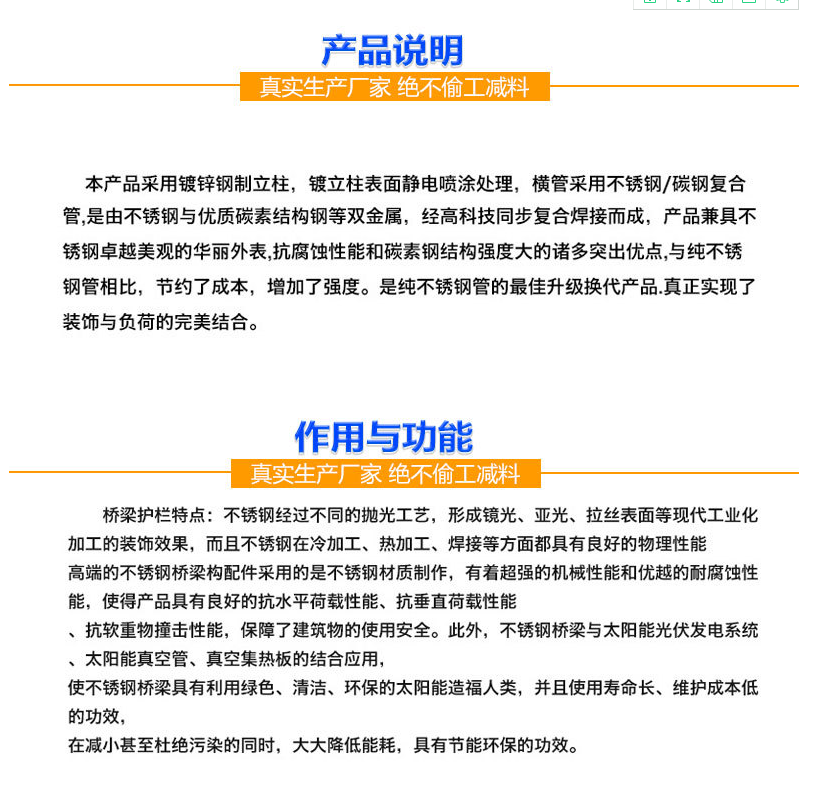 不銹鋼管:整個管都為不銹鋼的較輕,承重能力沒有復合管好,但是不容易生銹,不銹鋼材質又分好幾種200,201,300,301,304等,市場上一般為301材質,304的效果好,其次301。